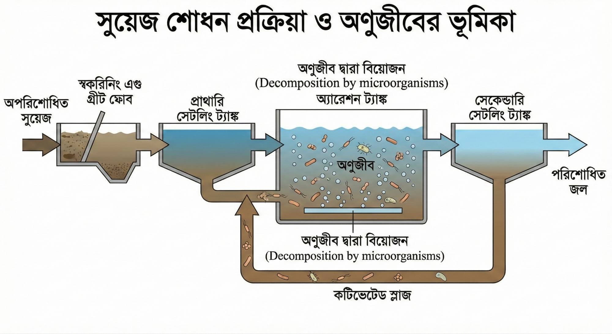 - BOD কমে গেলে জলকে সেটলিং ট্যাঙ্কে পাঠানো হয়, যেখানে ব্যাকটেরিয়ার ‘ফ্লকস’ থিতিয়ে পড়ে ‘অ্যাক্টিভেটেড স্লাজ’ তৈরি করে।